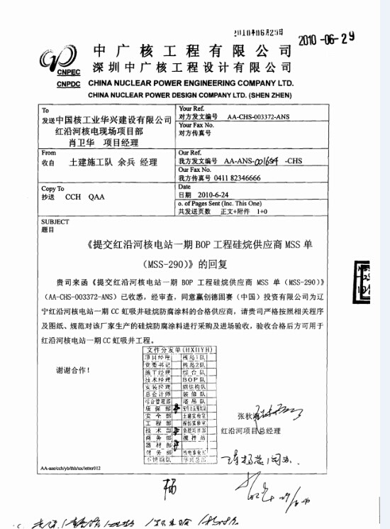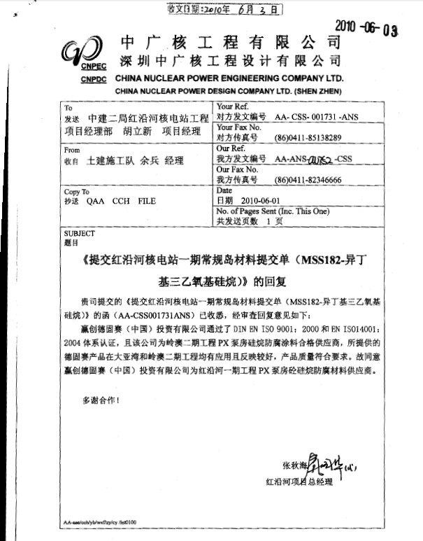 該項(xiàng)目一期工程的1至4號(hào)機(jī)組,在2010年6月至2012年12月期間,經(jīng)全國(guó)防腐專家(《海港工程混凝土防腐蝕技術(shù)規(guī)范》主編潘德強(qiáng)教授和大連理工大學(xué)海工方面專家組成的專家組,對(duì)紅沿河核電站所有需要應(yīng)用硅烷防腐的海工混凝土部位以及硅烷防腐技術(shù)進(jìn)行了評(píng)審,最終確定整個(gè)核電的海工混凝土防腐,采用我司提供的德國(guó)贏創(chuàng)德固賽特種化學(xué)有限公司的異丁基三乙氧基硅烷Protectosil BHN防腐解決方案,總面積為7萬(wàn)5千多平方米,包括PX泵房的進(jìn)水流道和前池、常規(guī)島和核島的CC排水口以及取水建筑物等。該項(xiàng)目是中國(guó)至今采用硅烷防腐技術(shù)最大的核電站項(xiàng)目,該項(xiàng)先進(jìn)的硅烷防腐技術(shù),不但可以大大延長(zhǎng)核電站的運(yùn)行壽命,減少核電站因鋼筋混凝土腐蝕帶來(lái)的停車檢修造成巨大潛在經(jīng)濟(jì)損失,還幫助核電站避免鋼筋混凝土腐蝕導(dǎo)致的核電站報(bào)廢和核廢料的短期產(chǎn)生,造福我們的子孫后代!